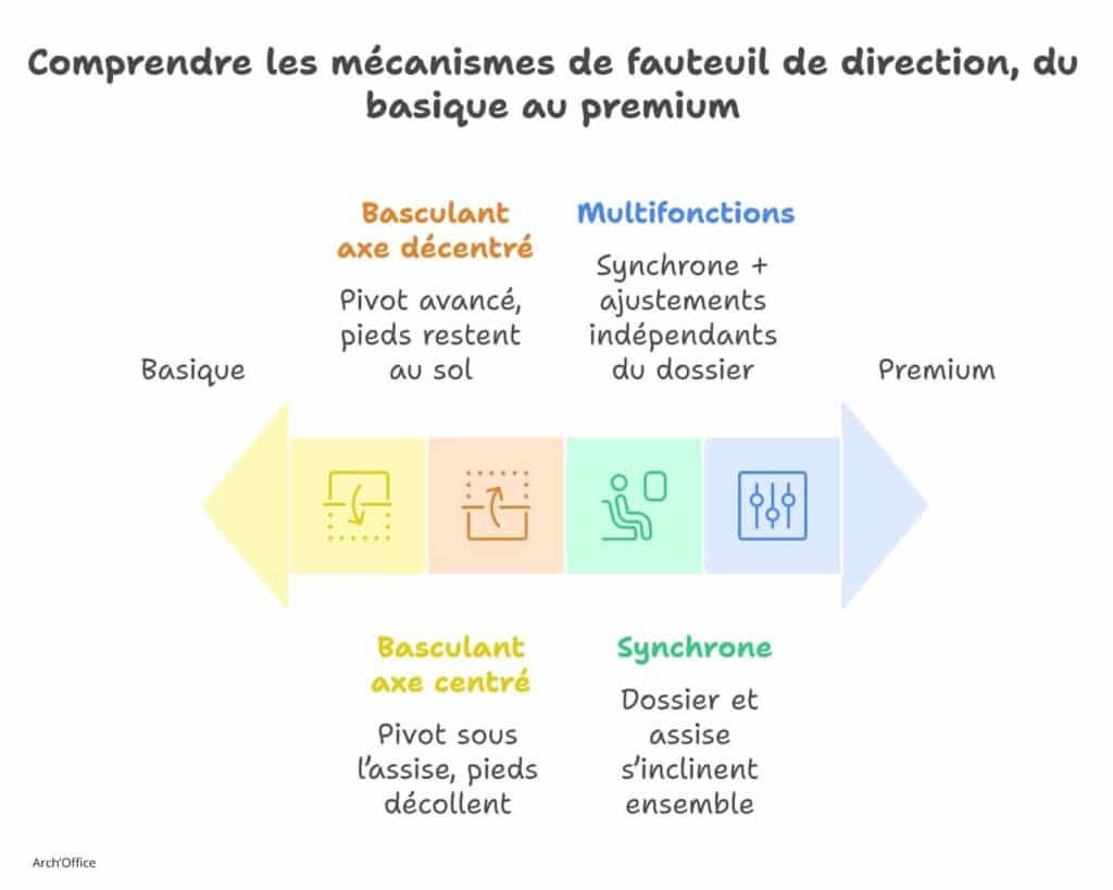 Mécanisme basculant axe décentré : Point de pivot avancé. Les pieds restent au sol. Confort amélioré pour usage quotidien modéré.